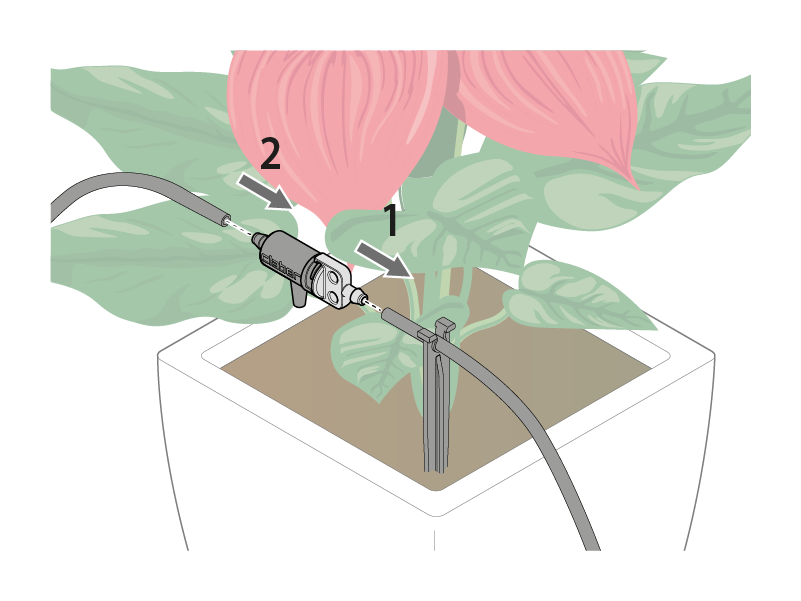 Stecken Sie die mitgelieferten Erdspieße aus Kunststoff in die Erde der Topfpflanzen: Jeder Erdspieß entspricht einem Tropfer (Mit dem Oasis Evolution können zwischen 1 und 20 Tropfer verwendet werden. Der Schlauch kann bis auf 20 m erweitert werden). In der Regel ist für kleine und mittlere Topfpflanzen ein Tropfer ausreichend, während in großen Topfpflanzen zwei Tropfer installiert werden sollten. Wenn die Anzahl an Tropfern verändert wird, bleibt die ausgegebene Wassermenge pro Tropfer gleich; es ändert sich jedoch die Dauer der Autonomie der Anlage.