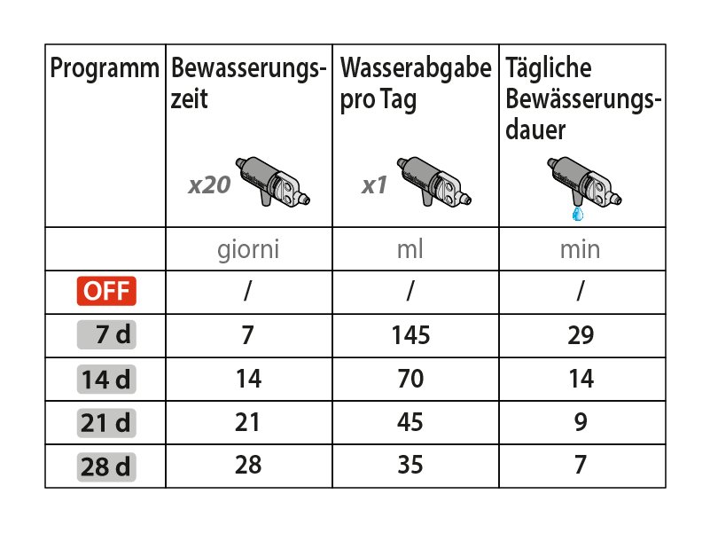 Unabhängig vom Wasserstand im Behälter gibt Oasis Evolution jeden Tag dieselbe Wassermenge an ihre Topfpflanzen ab (siehe Tabelle), für den gesamten programmierten Zeitraum; dies ist dank einer speziellen integrierten Vorrichtung zur automatischen Regulierung des Wasserdrucks möglich. Wie in der Tabelle ersichtlich, variieren die Dauer und die Wasserausgabe je nach gewähltem Programm.