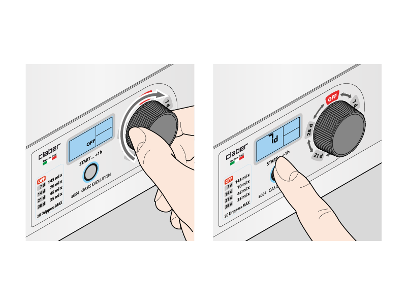 Zum Auswählen des gewünschten Programms stellen Sie den Drehschalter von der Position OFF auf die gewünschte Position: 7, 14, 21 oder 28 days (Tage), und drücken Sie START. Oasis Evolution ist jetzt in Betrieb und wird automatisch vom elektronischen Bewässerungscomputer gesteuert.