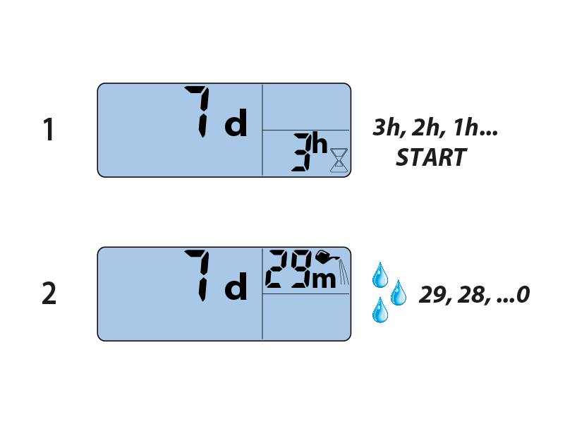 Das Display zeigt die verbleibende Zeit bis zum Beginn der ersten Bewässerung und, wenn die Bewässerung begonnen hat, die verbleibende Zeit bis zum Ende derselben.
