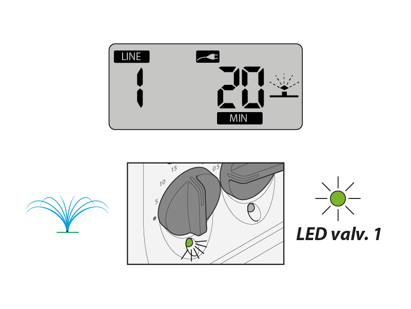 Während der Ausführung eines Bewässerungszyklus erscheinen auf dem Display das Symbol der laufenden Bewässerung, der aktuell aktive Kreis sowie die Restdauer der Bewässerung für diesen Kreis in Minuten. Das aktuell offene Ventil wird auch durch das grüne Blinken der zugehörigen LED angezeigt.