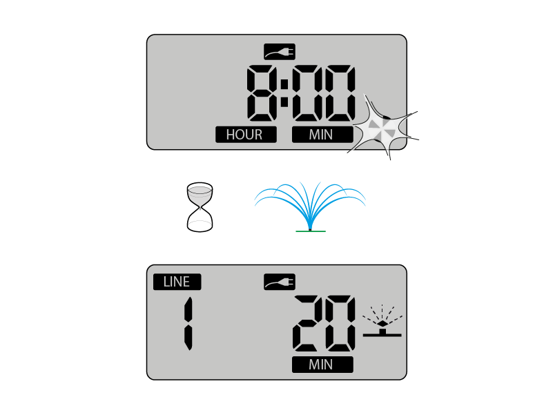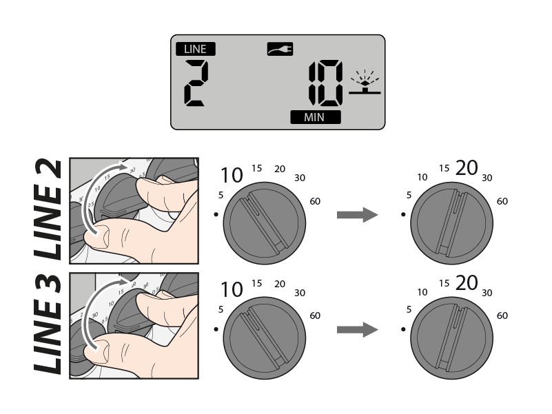 Beispiel: während einer Bewässerung am Kreis 2 ändere ich die Position der Drehschalter LINE 2 und 3 (z. B. von 10 min auf 20 min).