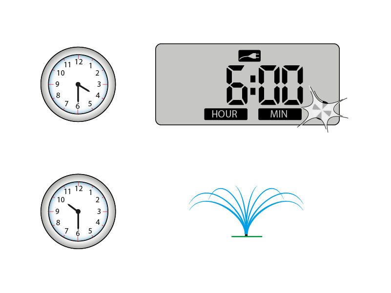 Die Bewässerung soll nicht sofort starten, sondern erst um 22:30 Uhr (d. h. nach 6 Stunden). Ich drücke die Taste START+… einmal und dann erneut 6 Mal, bis auf dem Display 6:00 angezeigt wird.