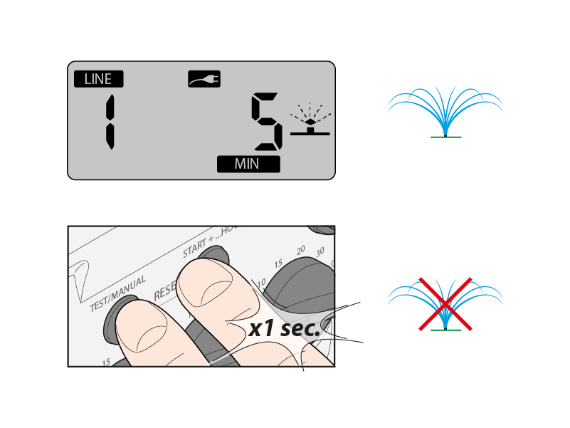 Die Funktion STOP (gleichzeitiges Drücken von TEST und START+. . . für 1 Sekunde) unterbricht die Ausführung eines laufenden Bewässerungszyklus. Die Bewässerung startet daraufhin wieder planmäßig mit dem nächsten Zyklus auf Basis der eingestellten Häufigkeit. Die Funktion STOP gestattet außerdem das vorzeitige Schließen eines offenen Ventils im TEST-Modus.