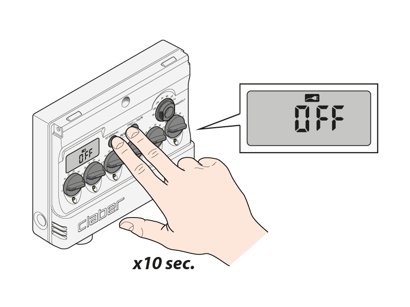 Die Funktion RESET schließt das Ventil, wenn es geöffnet ist, und schaltet den Bewässerungscomputer aus. Die Bewässerung wird unterbrochen bis zu einem neuen START+…- oder TEST-Befehl. Die Uhrzeit wird zurückgesetzt, während die Dauer und Häufigkeit unverändert bleiben. Um sie zu ändern, betätigen Sie manuell die einzelnen Schalter.