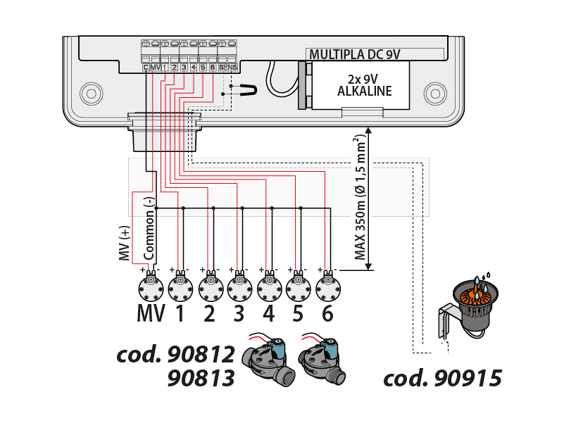 - der rote Draht (+) vom Master Valve (wenn verwendet) an die Klemme MV.
