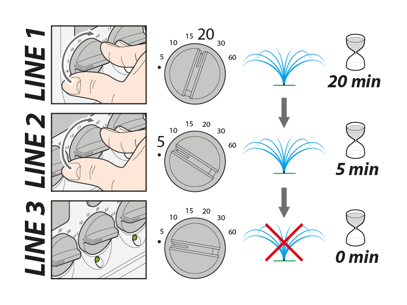 Zum Einstellen eines Bewässerungszyklus drehen Sie die Drehschalter LINE aller Kreise, die Sie aktivieren möchten, auf die gewünschte Dauer. Die einstellbare Dauer liegt zwischen 5 und 60 Minuten. Wenn Sie hingegen die Bewässerung an einem Kreis ausschließen möchten, stellen Sie den zugehörigen Drehschaltern auf • (null).
