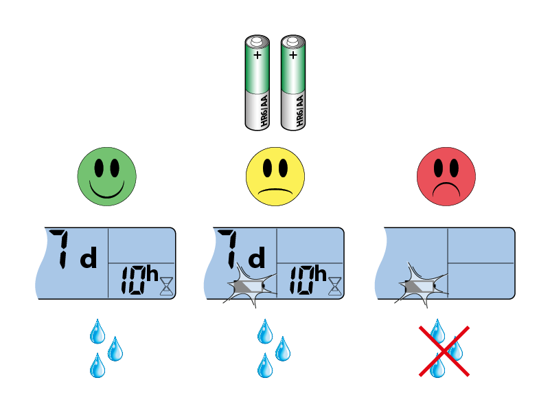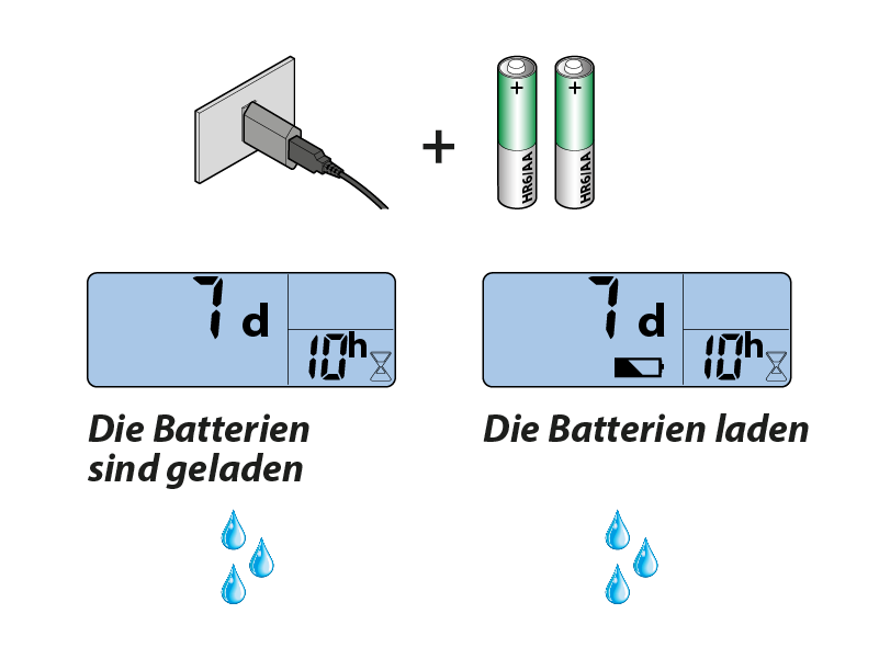 - mit 1,2V NiMH Akkus mit mind. 2400 mAh vom Typ AA/HR6, wobei jedoch im Falle ihrer vollständigen Entladung keine Bewässerungen stattfinden;