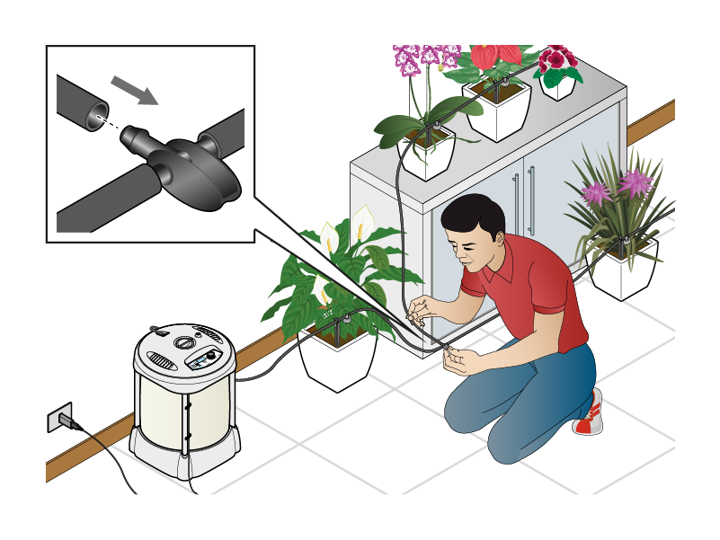 Stecken Sie je nach Anzahl der zu verwendenden Tropfer einen oder mehrere Erdspieße in jeden Topf und schneiden Sie den Schlauch 2 cm vom Erdspieß durch.