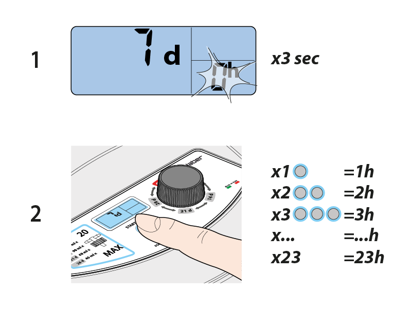 Drücken Sie erneut START, wobei die Anzahl an Betätigungen der Taste der Anzahl an Stunden entspricht, um die Sie den Start verzögern möchten. Die maximale einstellbare Verzögerung beträgt 23 h.