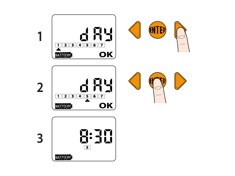 Im Beispiel befindet sich der Cursor unter der Nummer 5 und somit ist der aktuelle Wochentag der Donnerstag. Drücken Sie die ENTER-Taste, um die Einstellung zu bestätigen. Die Anzeige OK verschwindet und auf dem Display erscheinen die aktuelle Uhrzeit und der aktuelle Wochentag.