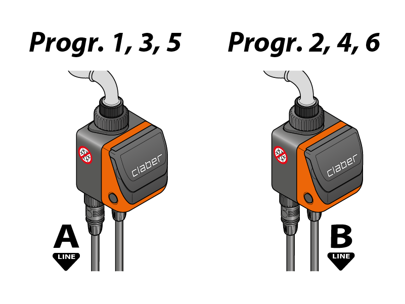 Der Bewässerungscomputer gestattet die Bewässerung auf zwei Kreisen, A und B. Für jeden Kreis können bis zu drei Programme eingestellt werden: Kreis A, Programm 1-3-5; Kreis B, Programm 2-4-6. Das ergibt insgesamt sechs Bewässerungsprogramme pro Tag.