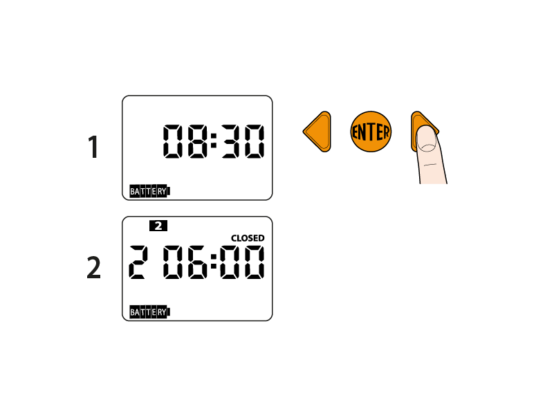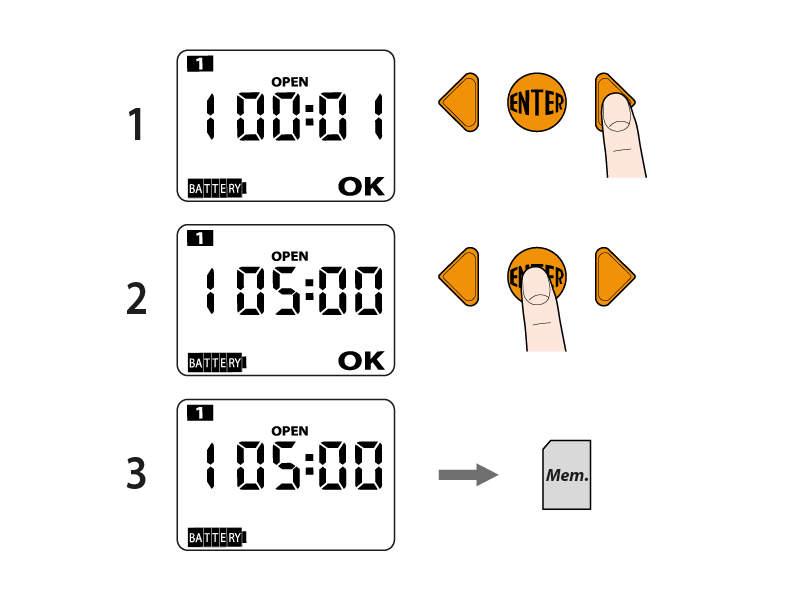 Auf dem Display bestätigt die Anzeige OK, dass Sie jetzt die Uhrzeit der Öffnung mit Hilfe der Pfeiltasten eingeben können (z. B. h 05:00); oben auf dem Display erscheint 1 (Programm 1). Bestätigen Sie die Uhrzeit mit der ENTER-Taste.