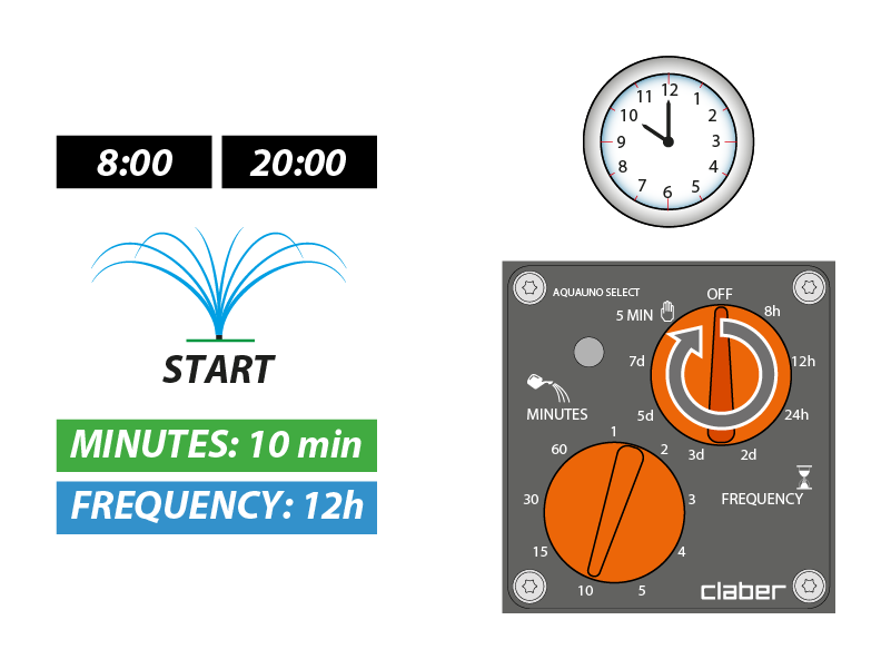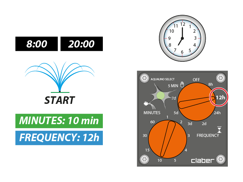 Wenn der Bewässerungscomputer beispielsweise um 20:00 Uhr programmiert wird (d. h. wenn die DAUER und HÄUFIGKEIT um diese Zeit eingestellt werden) und der Drehschalter „FREQUENCY“ (Häufigkeit) auf „12h“ steht, startet die erste Bewässerung sofort (also um 20:00 Uhr) und die folgenden Bewässerungen um 8:00 und um 20:00 Uhr am nächsten Tag u.s.w.