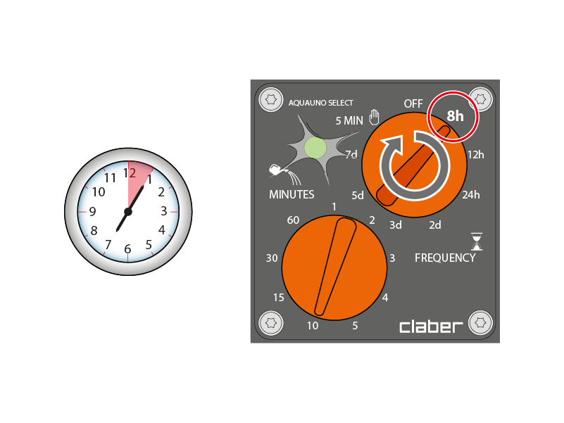Stellen Sie den Drehschalter „FREQUENCY“ auf die neue gewünschte Häufigkeit (z. B. von 12 h auf 8 h). Nach der Neuprogrammierung wird sofort eine Bewässerung der eingestellten Dauer gestartet. Die nachfolgenden Bewässerungen beginnen nach der mit dem Drehschalter „FREQUENCY“ eingestellten Anzahl von Stunden oder Tagen.