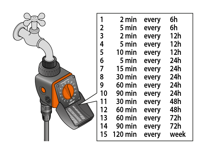 Auf dem Schutzdeckel finden Sie eine Übersicht mit den Eigenschaften aller Programme. Für jedes Programm sind die Bewässerungsdauer (wie lang bewässert wird) und die Bewässerungshäufigkeit (in welchen zeitlichen Abständen bewässert wird) voreingestellt; beide Parameter können nicht geändert werden.