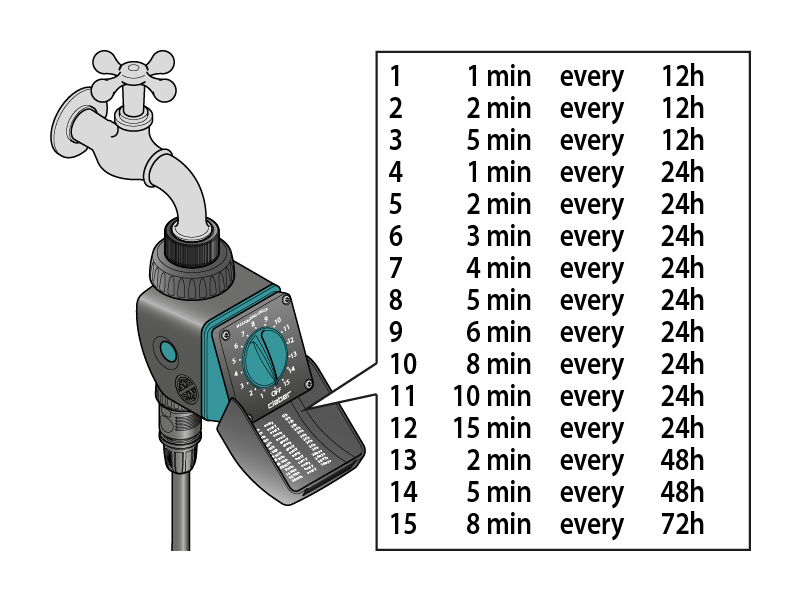 Auf dem Schutzdeckel finden Sie eine Übersicht mit den Eigenschaften aller Programme. Für jedes Programm sind die Bewässerungsdauer (wie lang bewässert wird) und die Bewässerungshäufigkeit (in welchen zeitlichen Abständen bewässert wird) voreingestellt; beide Parameter können nicht geändert werden.
