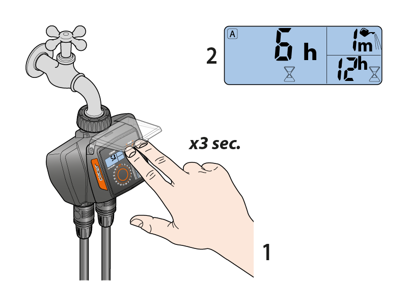 Nach Loslassen der Taste blinkt die eingestellte Stundenzahl 3-mal und dann beginnt der Countdown bis zum Bewässerungsstart, der auf dem Display „C“ über dem Symbol „Sanduhr“ angezeigt wird. Wenn Sie ein eingestelltes Programm anzeigen lassen möchten, drücken Sie die Taste des zugehörigen Kreises A oder B.
