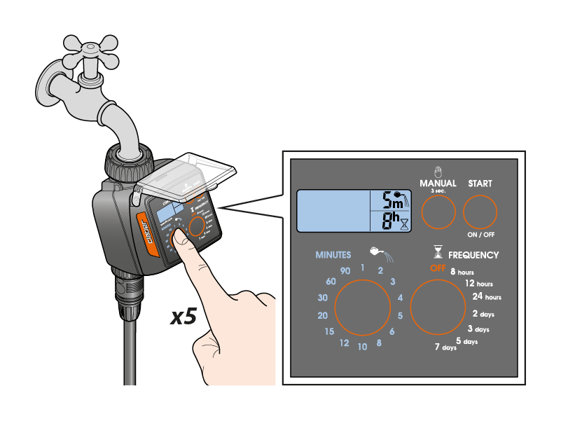 Wenn Sie zwischen zwei Bewässerungen eine zusätzliche Bewässerung durchführen möchten, können Sie eine manuelle Bewässerung mit der Dauer von 5 Minuten starten. Durch Drücken der Taste „MANUAL“ für mindestens 3 Sekunden gelangen Sie in den manuellen Betrieb.