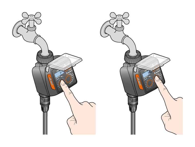 Nach Loslassen der Taste blinkt die eingestellte Stundenzahl 3-mal und dann beginnt der Countdown bis zum Bewässerungsstart, der auf dem Display „C“ über dem Symbol „Sanduhr“ angezeigt wird.