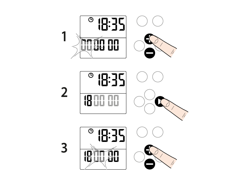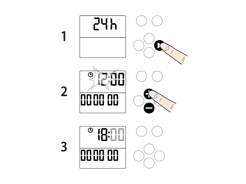 Einstellung der STUNDE. Drücken Sie die rechte Pfeiltaste, um die Einstellung der STUNDE aufzurufen (die Ziffer blinkt und weist so darauf hin, dass ein Wert eingegeben werden muss). Stellen Sie mit den Tasten + und - den Wert ein (im Beispiel: 18:00 Uhr).