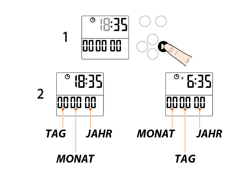 Einstellung des DATUMS. Drücken Sie die rechte Pfeiltaste, um die Einstellung des DATUMS aufzurufen. Wenn das 24h-Format gewählt wurde, muss das Datum in der Reihenfolge Tag-Monat-Jahr eingegeben werden, wenn das (angelsächsische) 12-h-Format gewählt wurde hingegen in der Reihe Monat-Tag-Jahr.