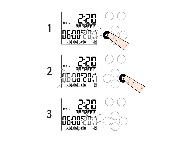 Nachdem Sie die Startzeit eingestellt haben, drücken Sie die rechte Pfeiltaste, um die Einstellung der DAUER der Bewässerung des Programms aufzurufen. Der Bewässerungscomputer stellt automatisch eine Dauer von 10 Minuten ein; diese kann verändert werden, zwischen mindestens 5 sec und höchstens 90 min. Mit den Tasten + und - stellen Sie die gewünschte Dauer ein (z. B. 20 Minuten). Wenn Sie die Taste gedrückt halten, laufen die Werte schneller.