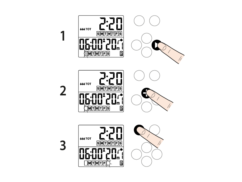 Wenn die Funktion PLUS auf ON steht, stellt der Bewässerungscomputer die Bewässerung automatisch an den geraden (ON 2) oder ungeraden Tagen (ON 1) ein. Wenn die Funktion PLUS ausgeschaltet ist (OFF) ist, nehmen Sie die Einstellung der Wochentage vor, an denen die Programme jeweils ausgeführt werden sollen.
