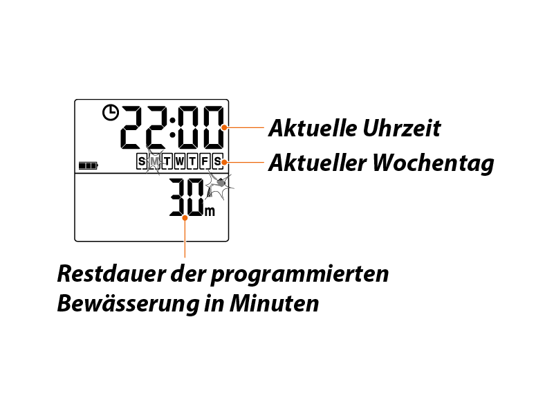 Seite der Uhrzeit. Nach einer Programmierung kehrt das Display zur Seite der Uhrzeit zurück. Auf der Seite der Uhrzeit werden im unteren Displaybereich die Startzeit und die Dauer der nächsten planmäßigen Bewässerung (im Beispiel 30 Minten, um 22:00 Uhr) und die Tage der Bewässerung angezeigt.
