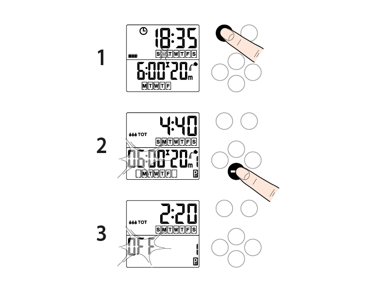 Zum vorzeitigen Beenden der manuellen Bewässerung stellen Sie den Bewässerungscomputer auf OFF (linken Pfeiltaste) und drücken Sie 3 Sekunden lang die entsprechende Taste.