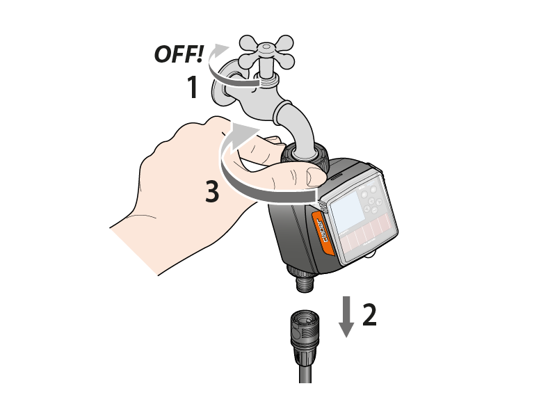 Schließen Sie den Bewässerungscomputer an den Wasserhahn an und verbinden Sie ihn mit der Anlage.