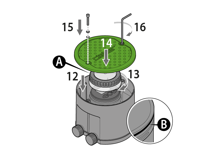 Setzen Sie die Batteriehalterung wieder in ihren Sitz ein und schrauben Sie den Verschluss wieder fest; kontrollieren Sie dabei, dass die Dichtung richtig sitzt. Setzen Sie den Bewässerungscomputer in seinen Sitz ein, schrauben Sie die transparente Abdeckung (A) mit der korrekt positionierten Dichtung wieder im Sitz (B) fest und verschließen Sie den Ventilschacht mit seiner Abdeckung, indem Sie sie immer mit den entsprechenden Schrauben und Dichtungen fixieren.