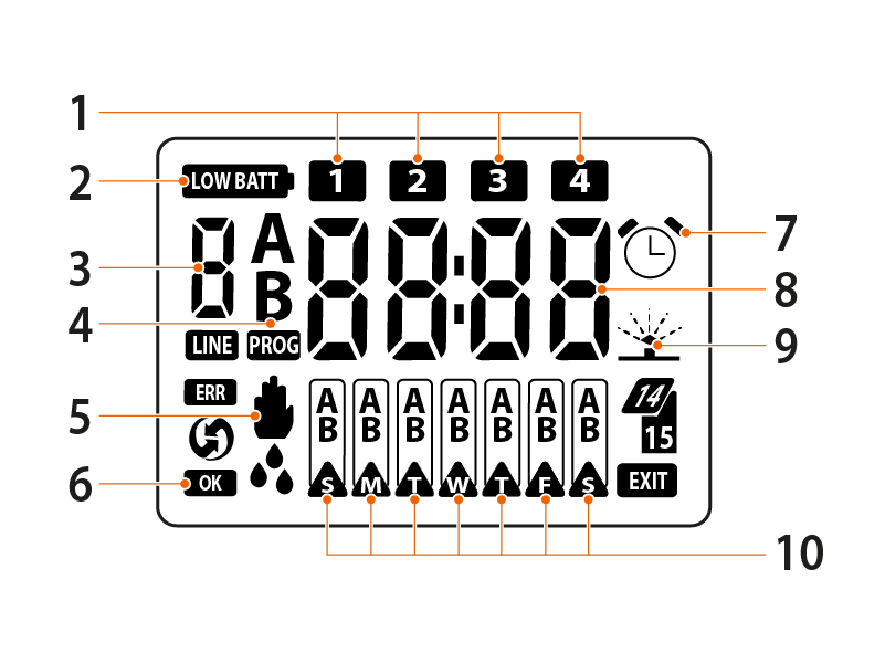 10) Zeigt den Wochentag an. In der Programmierung zeigt es an, an welchem Wochentag und mit welchem der beiden Programme bewässert werden soll