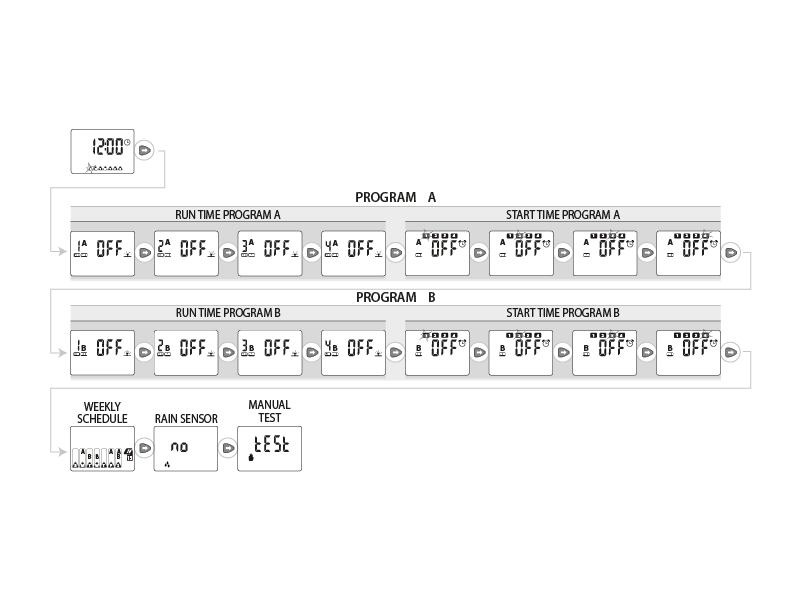 Der Bewässerungscomputer steuert bis zu 4 Bewässerungskreise. Jeder Kreis hat zwei Programme, A und B, die unabhängig voneinander sind. In beiden Programmen können bis zu 4 tägliche Starzeiten im Lauf von 24 h eingestellt werden. Jeder Start löst einen Bewässerungszyklus auf allen 4 Kreises aus, die nacheinander für die eingestellte Dauer, die von 1 Minute bis höchstens 60 Minuten betragen kann, bewässern.