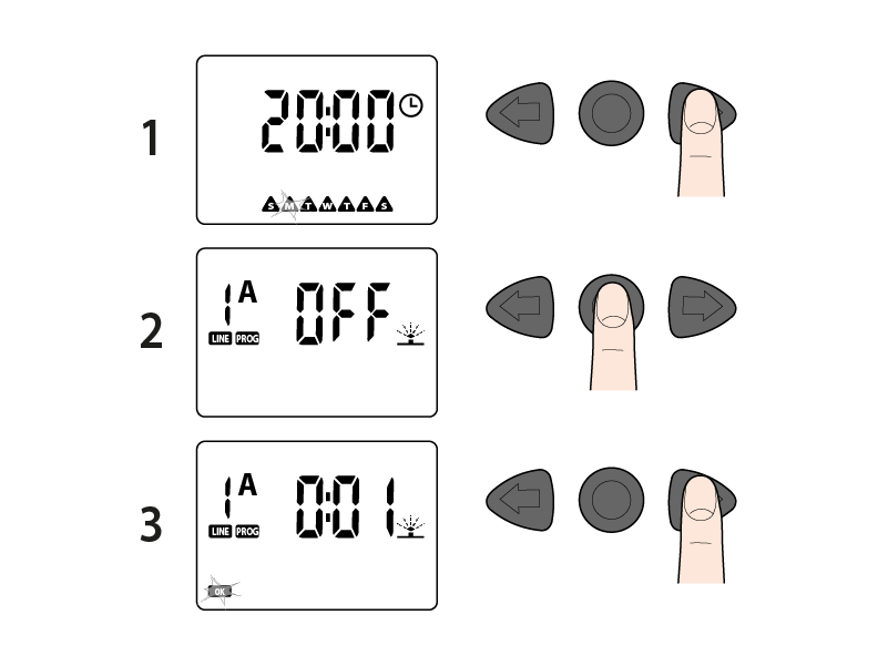 Wenn ein Bewässerungszyklus den Gebrauch eines Kreises nicht vorsieht, ist es ausreichend, für diesen die Bewässerungsdauer auf OFF einzustellen.