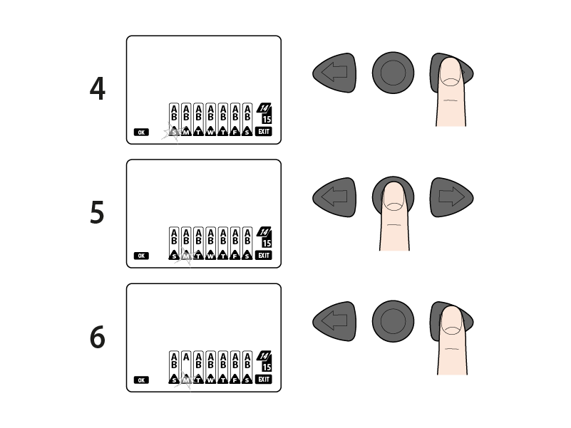 Drücken Sie die Pfeiltasten, um zu blättern und den aktuellen Tag auszuwählen. Die angezeigten Tage sind: S Sonntag, M Montag, T Dienstag, W Mittwoch, T Donnerstag, F Freitag, S Samstag.