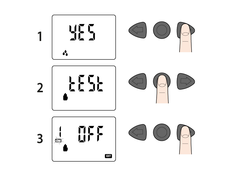 Beim Aufrufen des TEST-Modus werden eventuelle automatische Bewässerungen unterbrochen.