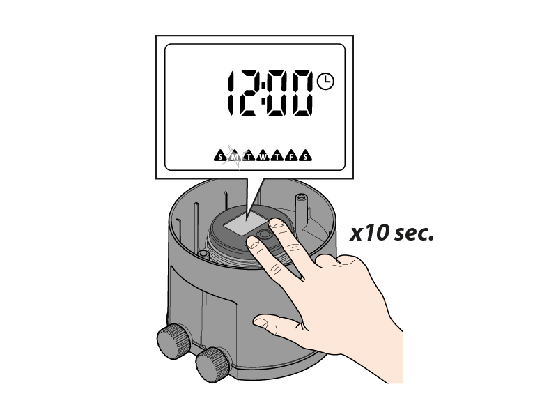 Um den Bewässerungscomputer auf die Fabrikeinstellungen zurückzusetzen, halten Sie die beiden Pfeiltasten gleichzeitig mindestens 10 Sekunden lang gedrückt, bis auf dem Display 12:00 erscheint. Programmieren Sie den Bewässerungscomputer dann vollständig neu, wie in den Kapiteln zur Programmierung beschrieben.