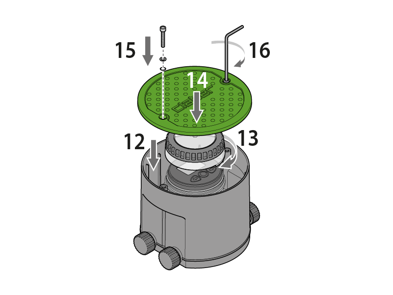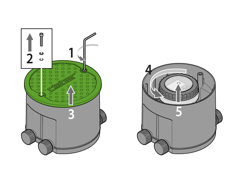 Setzen Sie die Batteriehalterung wieder in ihren Sitz ein und schrauben Sie den Verschluss wieder fest; kontrollieren Sie dabei, dass die Dichtung richtig sitzt. Setzen Sie den Bewässerungscomputer in seinen Sitz ein, schrauben Sie die Abdeckung wieder fest und verschließen Sie den Ventilschacht mit seiner Abdeckung, indem Sie sie mit den entsprechenden Schrauben und Dichtungen fixieren.