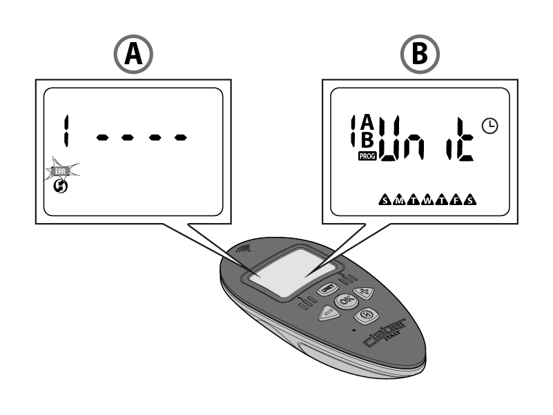 (A) Zuweisung nicht erfolgt: das Funk-Symbol leuchtet fix und das Fehler-Symbol blinkt.
