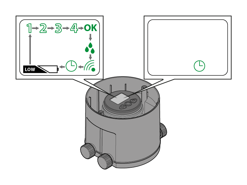 Betriebsstatus: Zugewiesen, Uhrzeit NICHT synchronisiert zwischen beiden Geräten (zum Beispiel wegen eines Verlusts der Uhrzeit nach längerem Batterieausfall): Die Bewässerungsprogramme werden zu anderen als den an der Funk-Fernbedienung eingestellten Uhrzeiten vorgenommen.