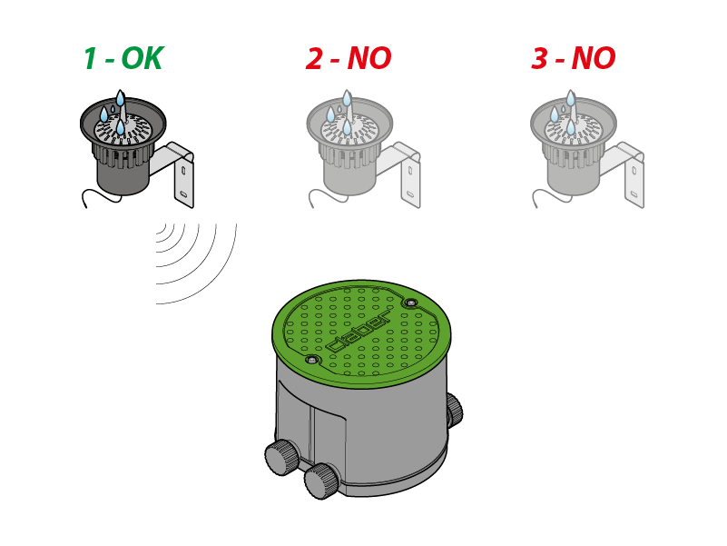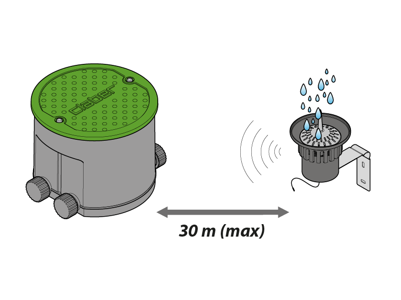 Der Hydro-4 RF erkennt das Signal eines in der Nähe installierten Rain Sensor RF, ohne dass dazu eine Zuweisung erforderlich ist, sofern die Geräte in einer Entfernung von höchstens 30 Meter ohne Hindernisse und ohne andere Funksignale platziert werden.