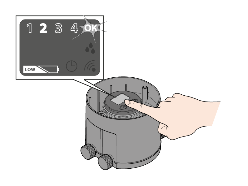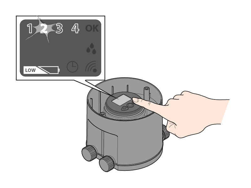 Drücken Sie die OK-Taste, um das gewählte Magnetventil zu öffnen (wenn das Ventil geöffnet ist, blinkt das Symbol OK und die zugehörige Nummer leuchtet fix).
