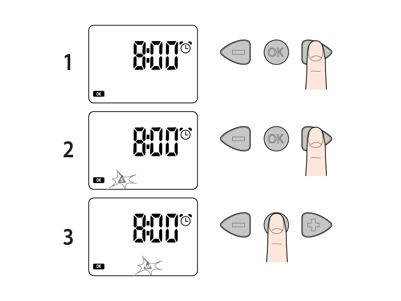 Zum Einstellen der Startzeit 1 drücken Sie OK, das Symbol 1 leuchtet daraufhin fix. Geben Sie mit den Pfeiltasten die Startzeit der Bewässerung 1 ein (z. B. 8.00) (wenn Sie die Tasten gedrückt halten, läuft der Wert schneller).