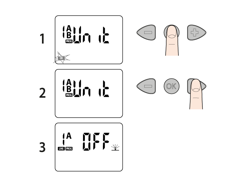 Drücken Sie die UNIT-Taste. Vor Einstellen der Dauer der Bewässerungen wählen Sie, ob Programm A, B oder beide aktiviert werden sollen: Drücken Sie OK und wählen Sie mit den Pfeiltasten die zu aktivierenden Programme.