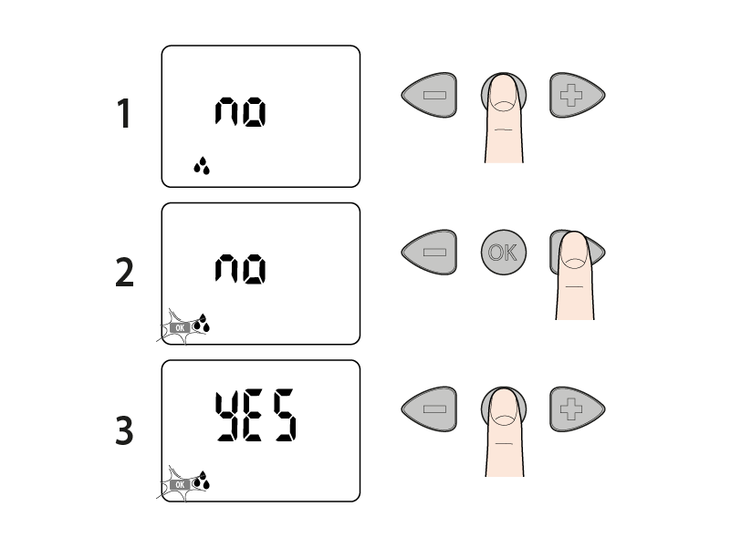 Mit der OK-Taste greifen Sie auf die Aktivierung/Deaktivierung des Regensensors zu; es blinkt die Meldung OK. Durch Drücken der Pfeiltasten wechseln Sie von YES (Sensor aktiv) zu NO (Sensor nicht aktiv) und umgekehrt. Bestätigen Sie die Auswahl durch Drücken der OK-Taste.