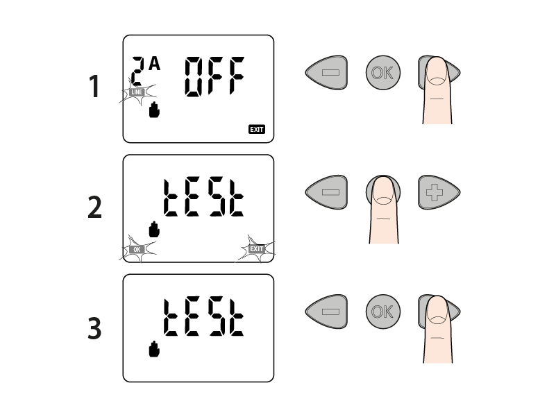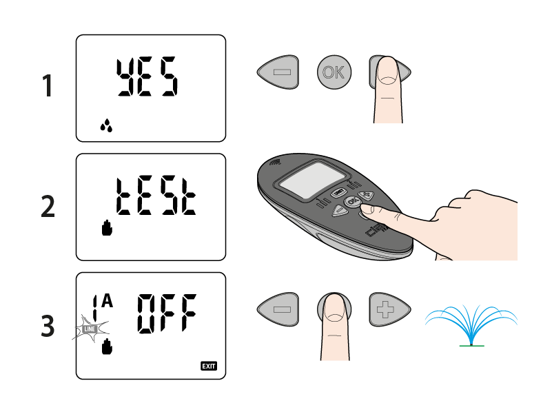 Drücken Sie die rechte Pfeiltaste, um zur nächsten Programmierungsseite zu wechseln: manueller Test. Drücken Sie die RF-Taste, um die Kommunikation zwischen der Fernbedienung und dem Hydro-4 RF zu aktivieren: Die Meldung TEST blinkt kurz. Auf dem Display erscheinen der Kreis 1 und die Meldung OFF. Drücken Sie OK, um die Bewässerung für eine voreingestellte Dauer von 5 Minuten zu aktivieren.