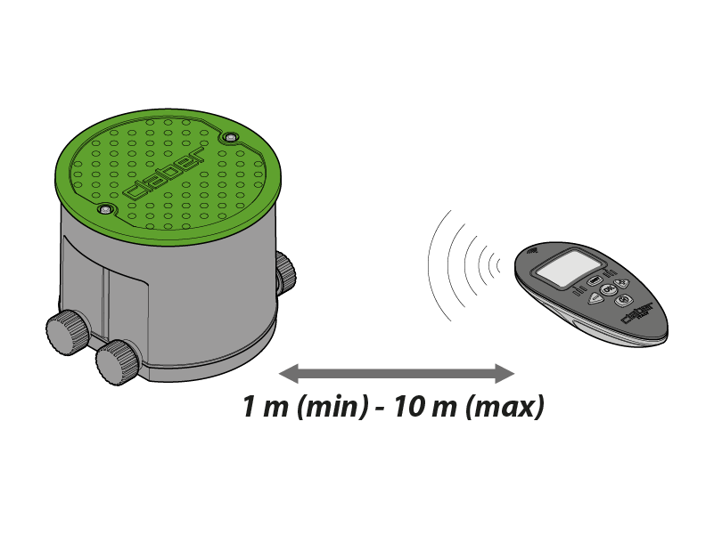 Hydro-4 RF wird automatisch über eine separat erhältliche Funk-Fernbedienung programmiert (Art. 8347, steuert bis zu 2 Funkgeräte, oder Art. 8348, steuert bis zu 6 Funkgeräte). Ohne Funk-Fernbedienung ist nur die manuelle Bewässerung möglich.
