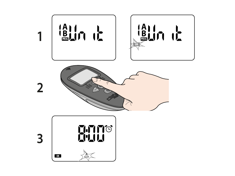 Drücken Sie gleichzeitig die drei Tasten des Hydro-4 RF und halten Sie sie 5 Sekunden lang gedrückt, bis das UHR- und das FUNK-Symbol rot zu blinken beginnen.
