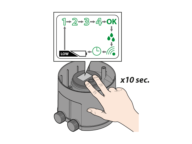 Der RESET-Vorgang, d. h. das Zurücksetzen auf die Fabrikeinstellungen, löscht alle Bewässerungsprogramme und die Zuweisung zum Rain Sensor RF, während die eventuelle Zuweisung mit der Funk-Fernbedienung erhalten bleibt.